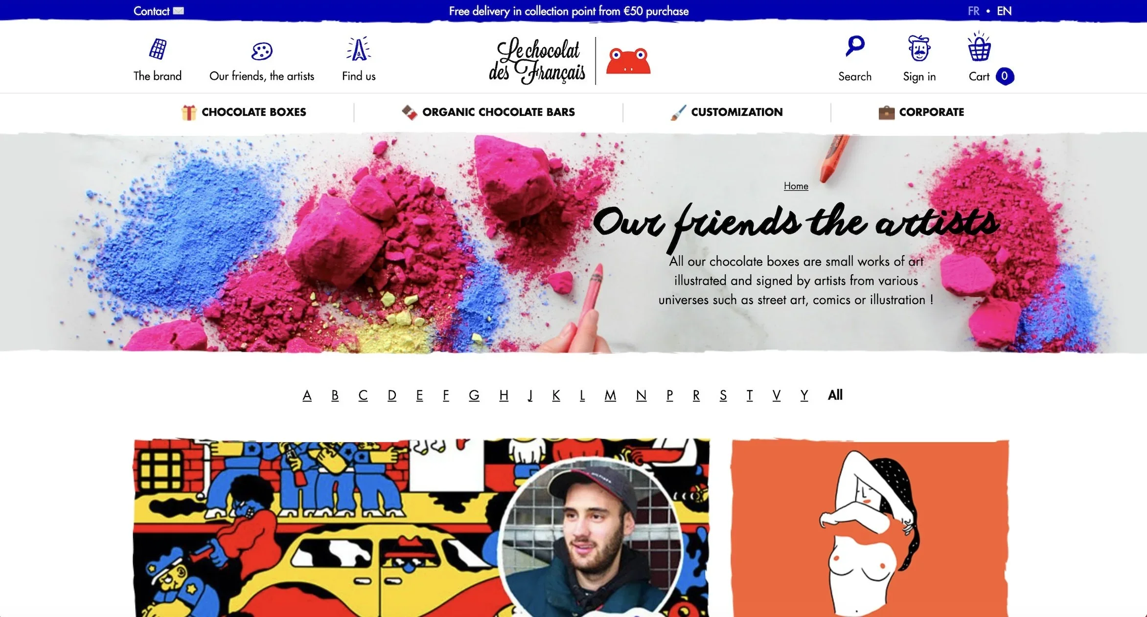 “Our mission is to be identified as the chocolate brand dedicated to artists,” Masson explains. And that they do with Our Friends, the Artists. It’s a collection of truncated portfolios of the artists whose work adorn their chocolate bars. Each artist page includes a brief bio, link to the artist’s site, selected artwork, and of course, images of their Le chocolat des Français packaging.